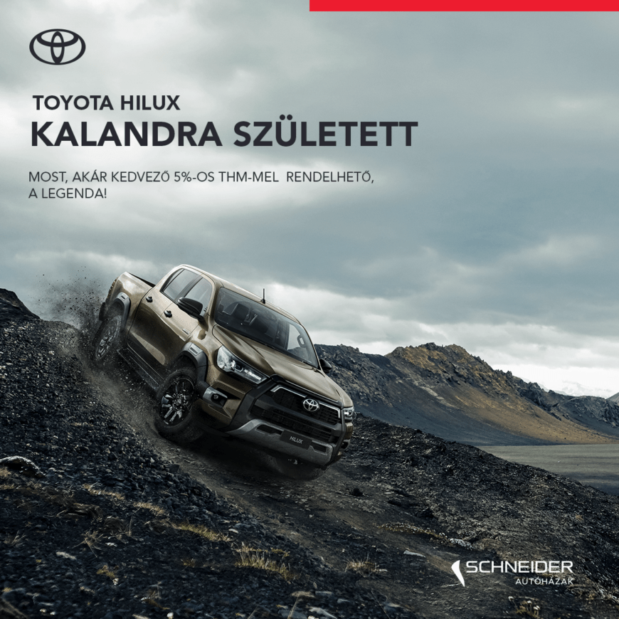 A legendás Toyota Hilux már több, mint fél évszázada bizonyítja kirobbanó erejét és rátermettségét. A 3,5 tonna vontató kapacitásnak és 1 tonna teherbírásnak köszönhetően válik a mindennapok hősévé. Most kedvező, mindössze 5%-os THM-mel megrendelhető a Schneider Autóház kínálatából.